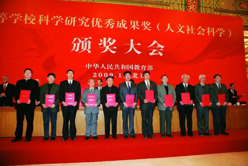 《南京大屠杀史料集》获得教育部高校科学研究优秀成果奖(人文社会科学)中国历史类一等奖,张宪文(右三)代表全体编者上台领奖